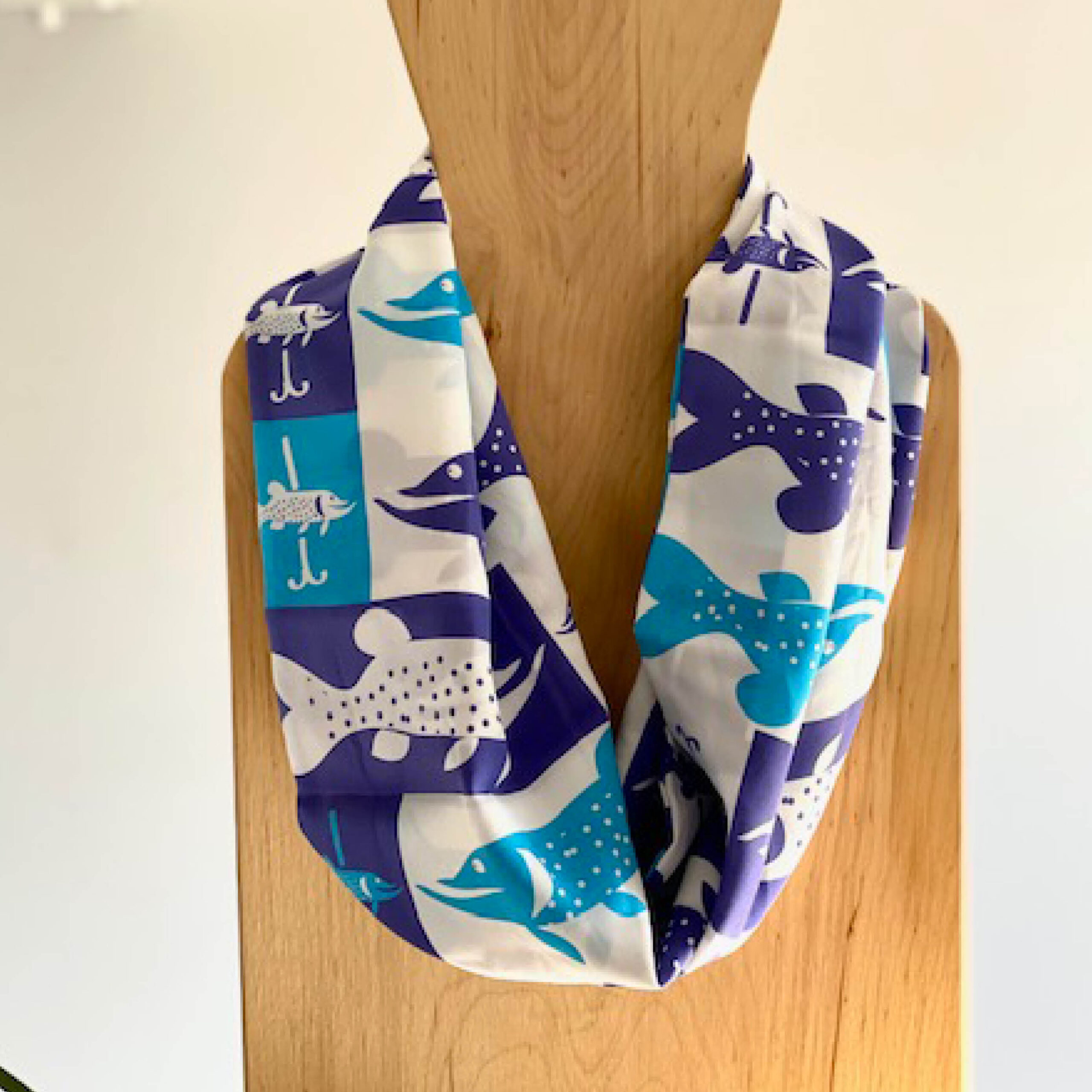 infinity silk scarf with silly fish design. approximately 9″ wide and 70″ around.